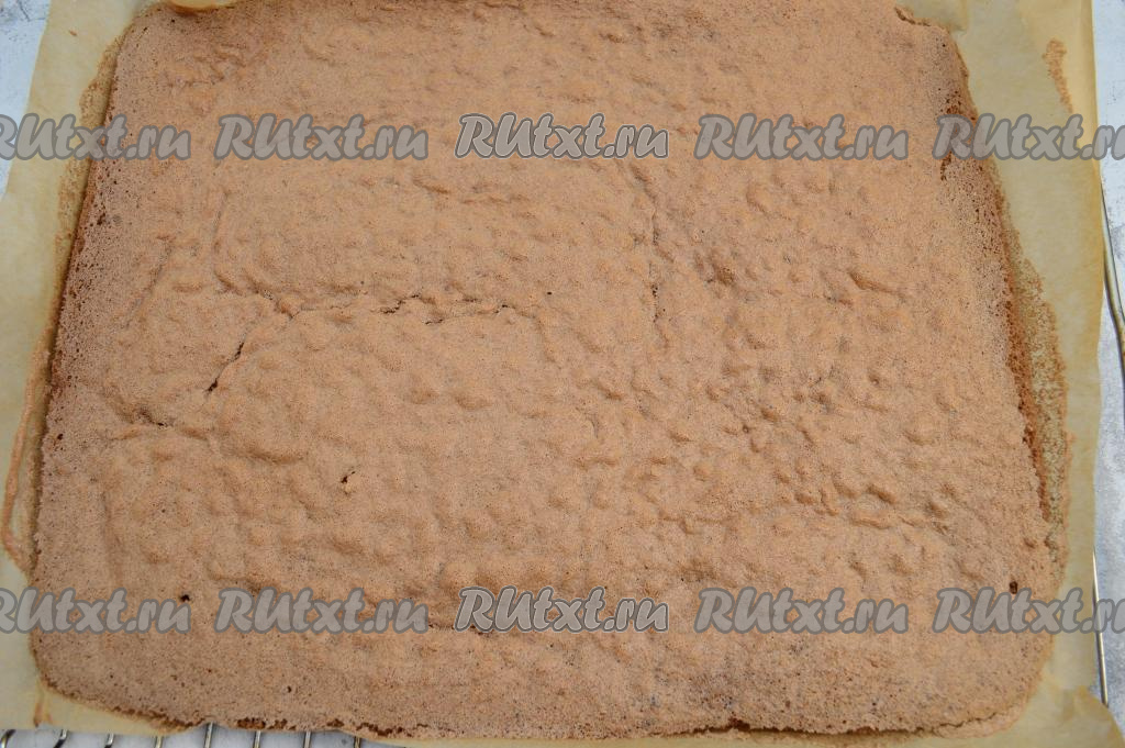 Духовку заранее разогреть до 180 градусов, затем поставить в неё противень с шоколадным тестом. Выпекать минут 12-14 (до готовности) при температуре 180 градусов. Готовность выпечки легко проверить, проколов корж сухой зубочисткой, если бисквит уже готов, значит зубочистка после прокола останется чистой и сухой. Важно не пересушить шоколадный бисквит в духовке. Достать противень из духовки. Переложить корж с противня на стол.