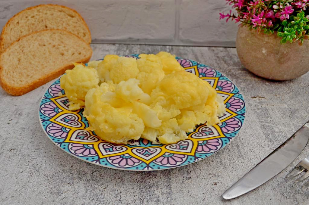 Вкусную, нежнейшую цветную капусту, запечённую в яйце с сыром, достать из духовки, сразу можно раскладывать по тарелкам и подавать к столу.