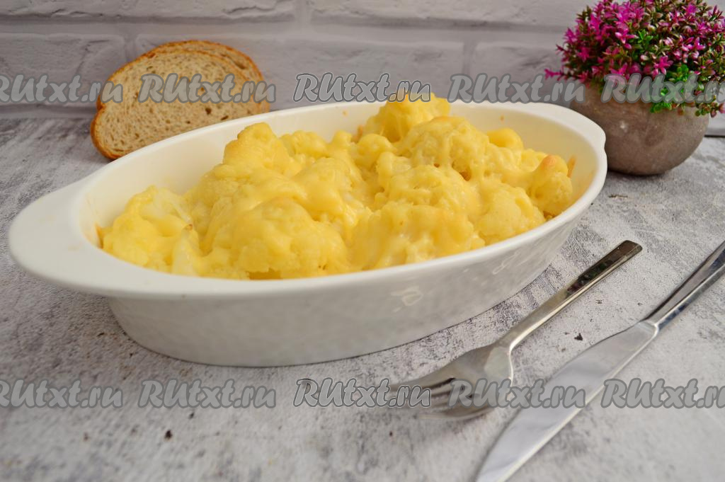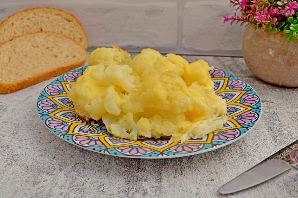 Поставить форму с цветной капустой в яйце с сыром в разогревшуюся духовку. Запекать 25-30 минут (до расплавления сыра) при температуре 180 градусов. Сыр должен расплавиться и покрывать капусту нежным слоем. Не стоит продолжать держать капусту до момента, когда сыр станет покрываться румяной корочкой. Вкуснее, когда сыр остаётся в меру мягким.