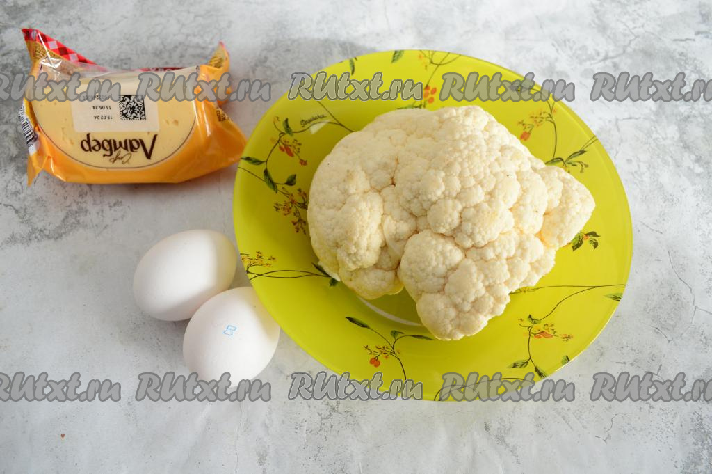 Подготовить продукты. Цветную капусту осмотреть, срезать, если есть, потемнения на соцветиях. Затем промыть капусту водой. Сыр можно взять любой твёрдых сортов.