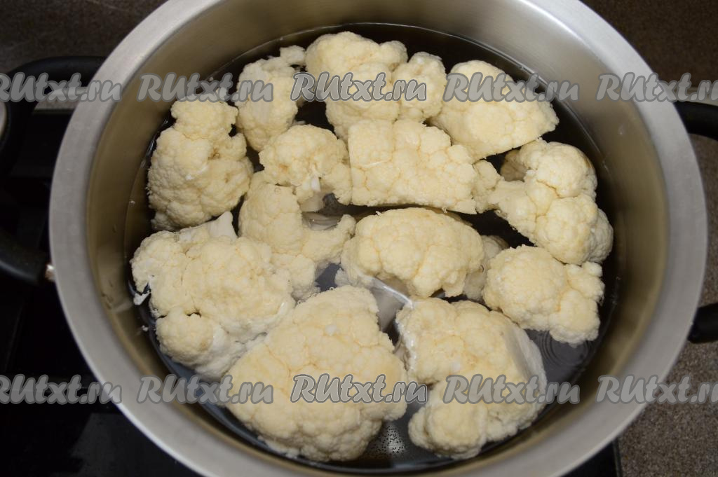 Соцветия цветной капусту выложить в кастрюлю, полностью залить водой и поставить на огонь. После закипания, подсолив воду, варить цветную капусту минут 6-7 на небольшом огне. Отваренные соцветия капусты должны прокалываться ножом практически без усилий. Воду из кастрюли слить, дать варёным соцветиям остыть.