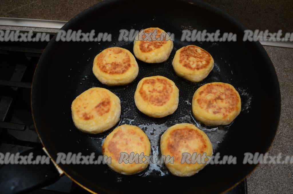Затем переверните сырники и жарьте их 2-3 минуты (до подрумянивания снизу).