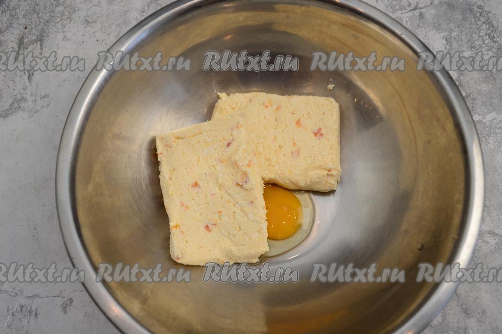 В миску вбейте сырое яйцо, добавьте творожную массу с курагой. Творожная масса достаточно сладкая, поэтому сахар в тесто для сырников я не добавляю.