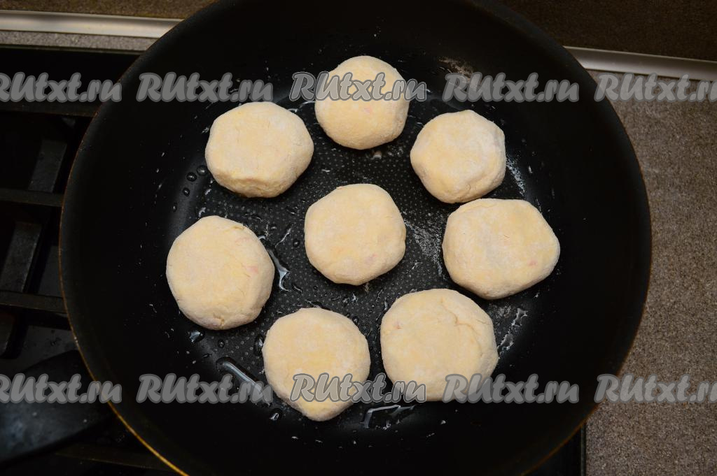 Сковороду хорошо разогрейте с растительным маслом. Сделайте огонь средним. На сковороду выложите заготовки сырников. Жарьте сырники 2-3 минуты (до подрумянивания снизу).