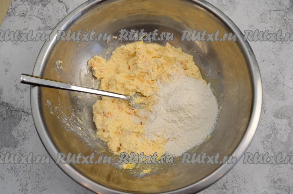 Вилкой смешайте до однородности творожную массу и яйцо. Затем всыпьте 1 столовую ложку муки. Вмешайте муку в тесто с помощью вилки (или силиконовой лопатки).