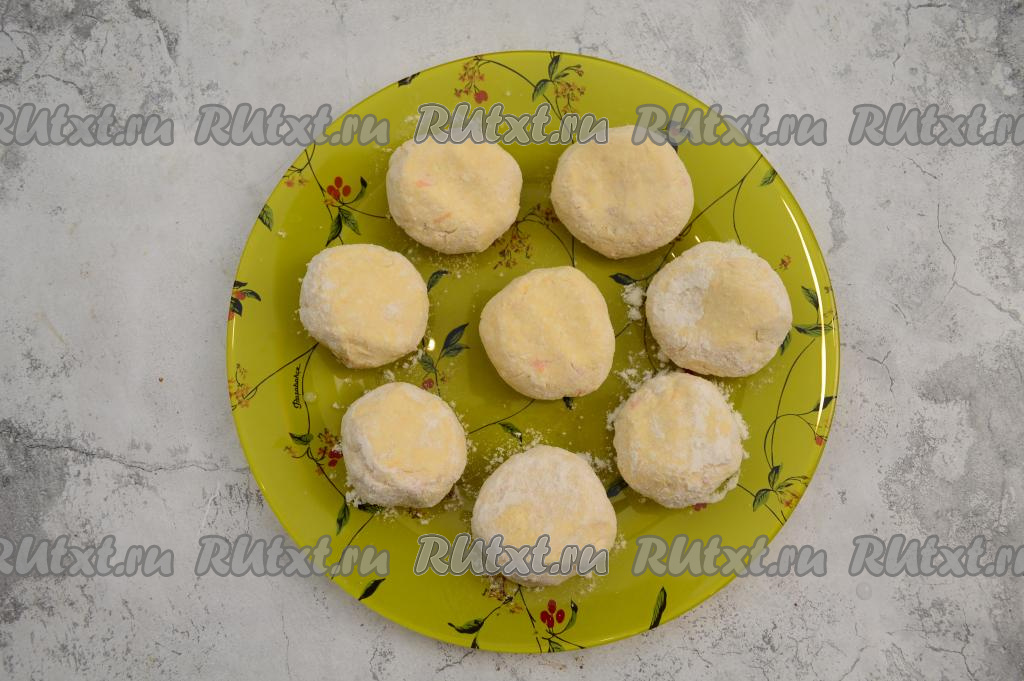 Сформированный сырник выложите на тарелку и слегка приплюсните его сверху ладонью. Таким образом руками, слегка смоченными водой, сформируйте все 8 сырников из творожной массы с курагой.