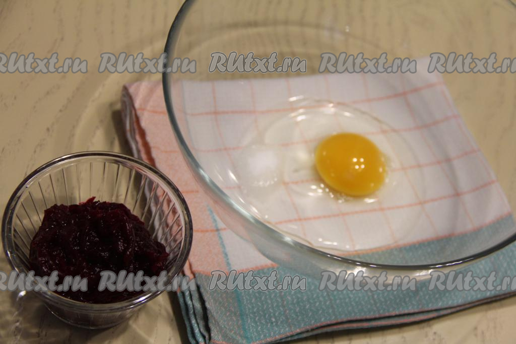 Остывшую свеклу натереть на мелкой тёрке и добавить к яйцу, взбитому с солью.