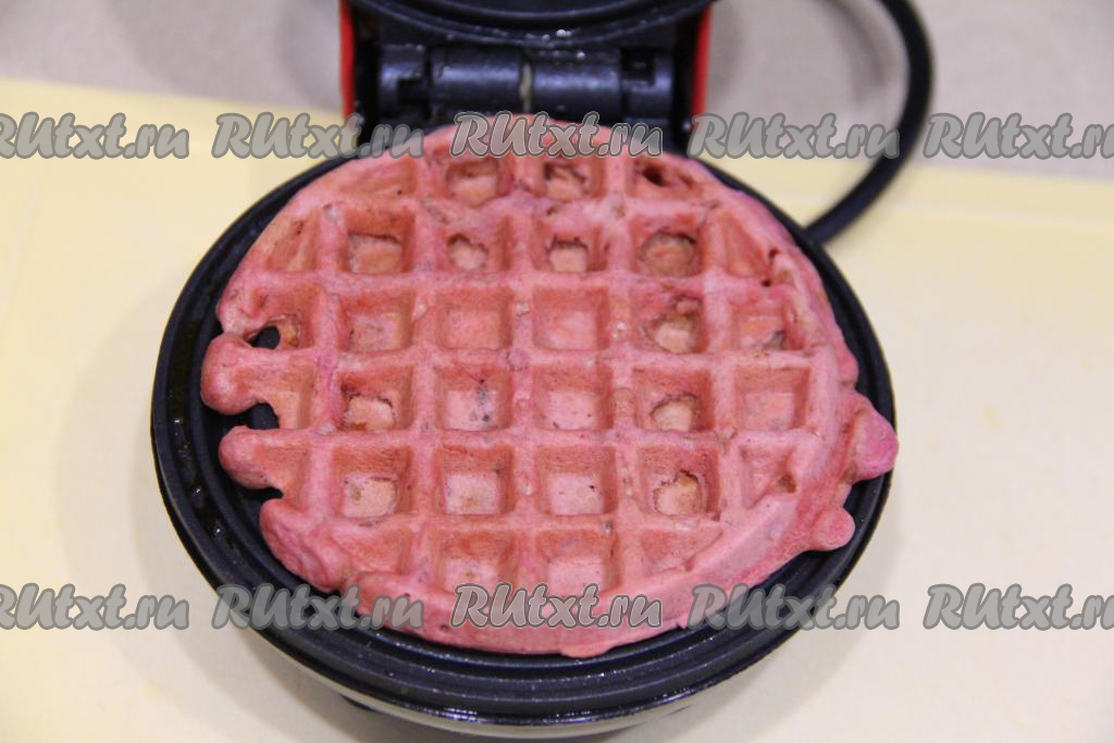 Выпекать свекольную вафлю до готовности. Время выпекания зависит от вафельницы и выставленной в ней температуры.