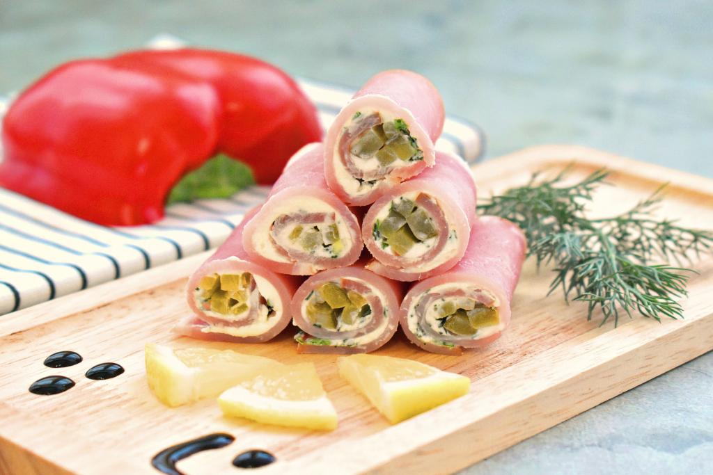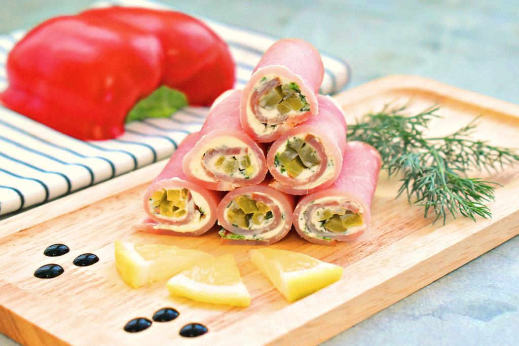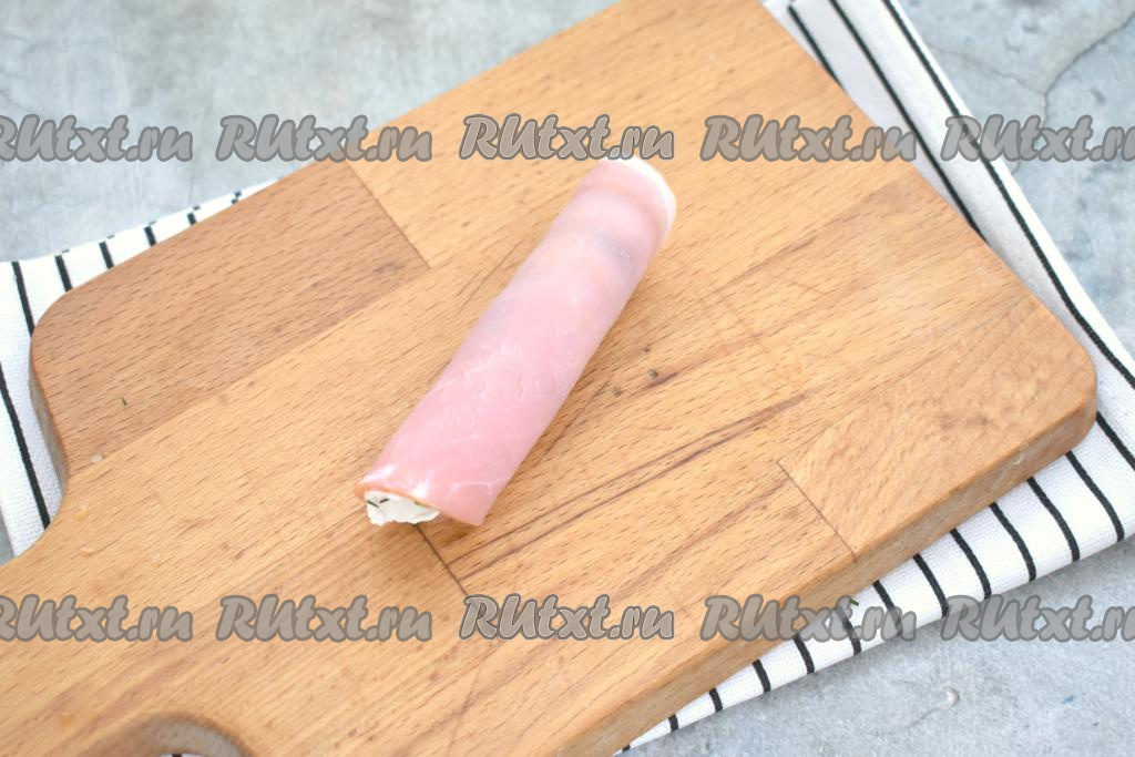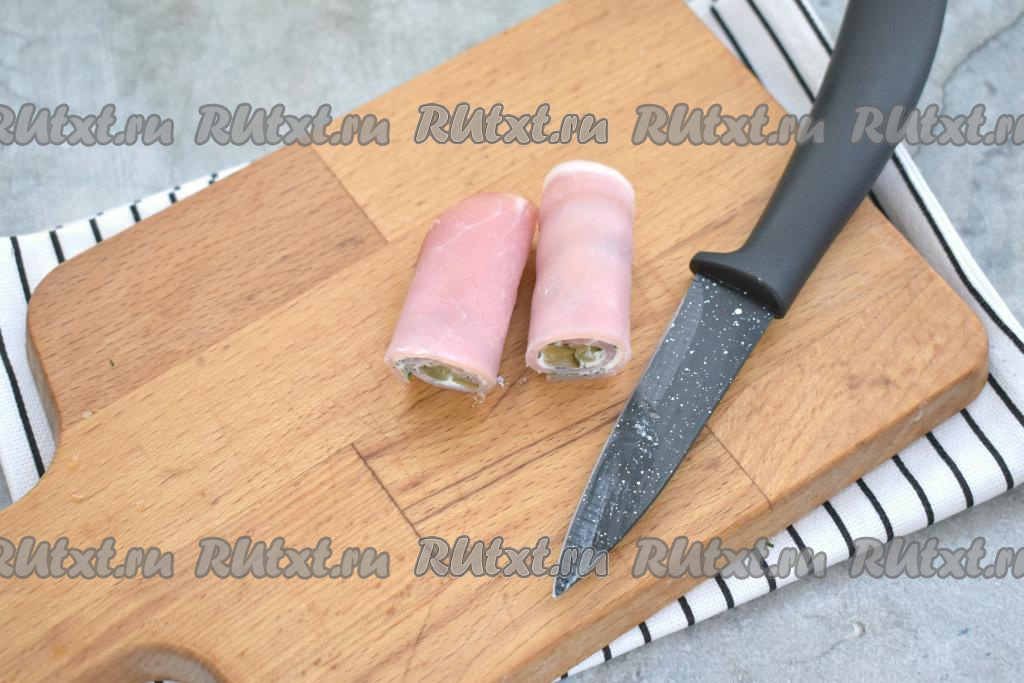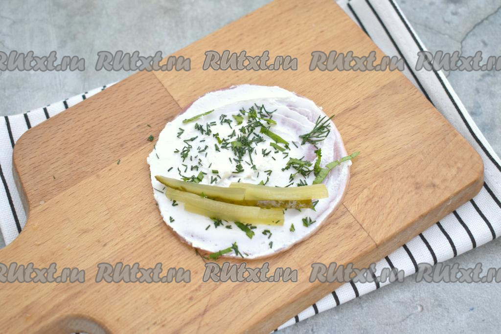Начиная со стороны с огурцом, сворачиваем ломтик ветчины в рулетик.