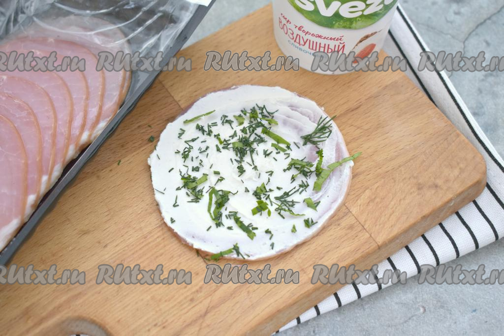 Ветчину, смазанную творожным сыром, посыпаем частью нарезанной зелени.