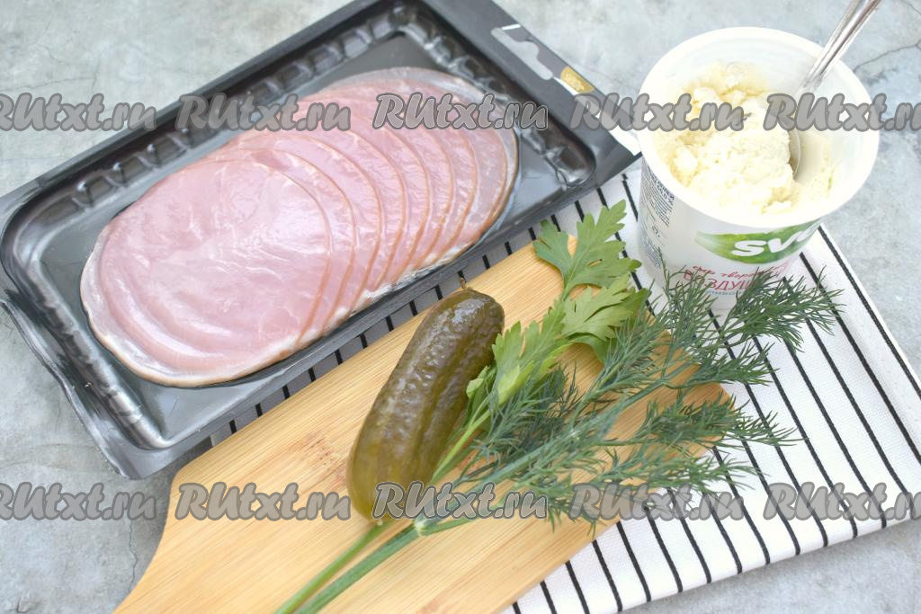 Вот такие продукты потребуются для приготовления закуски. Ветчину рекомендую взять в нарезке, ведь тонко нарезанная ветчина хорошо сворачивается и не рвётся. Зелень можете взять любую на ваш вкус, например, подойдёт укроп, зелёный лук, петрушка.