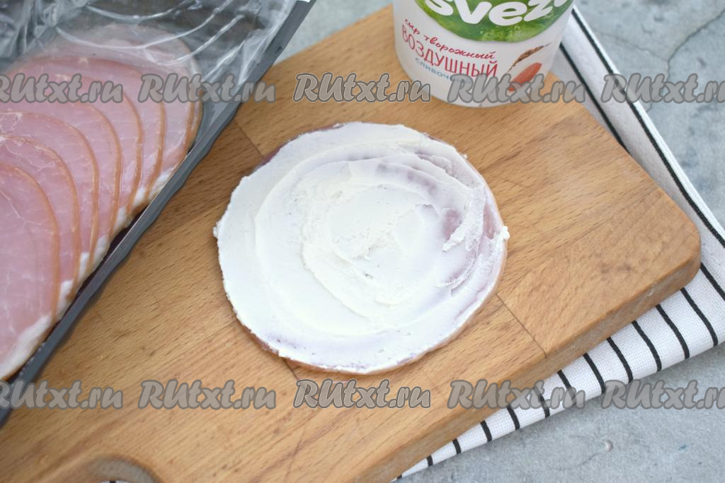 Кладём на разделочную доску (или на тарелку) тонкий ломтик ветчины. Покрываем всю поверхность ветчины тонким слоем творожного сыра.