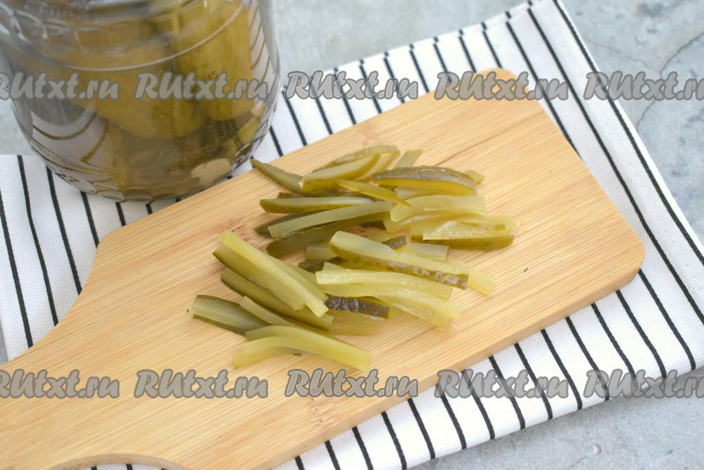 Солёный огурец нарезаем достаточно тонкой соломкой.