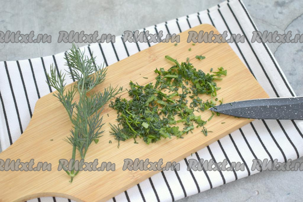 Заранее моем зелень, стряхиваем лишнюю влагу, а затем обсушиваем и нарезаем мелко.