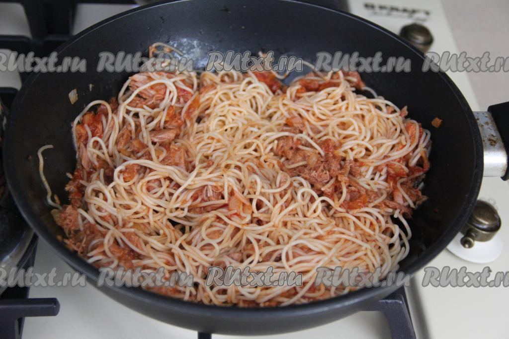 Перемешать спагетти с тунцом и прогреть в течение 2-3 минут, иногда помешивая.