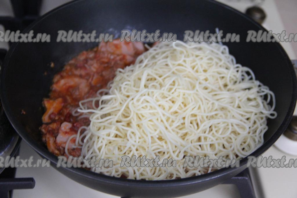 Затем в сковороду с консервированным тунцом добавить отваренные спагетти.