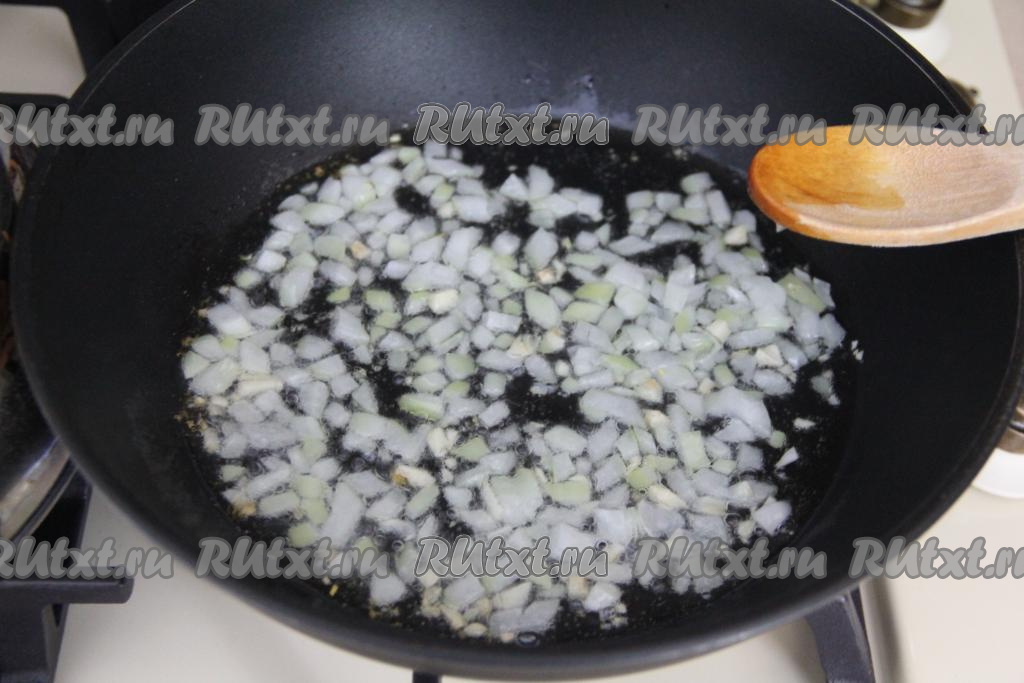 В сковороде хорошо прогреть растительное масло, выложить нарезанные лук и чеснок, перемешать и обжаривать минуты 2-3 (до прозрачности лука), иногда помешивая.