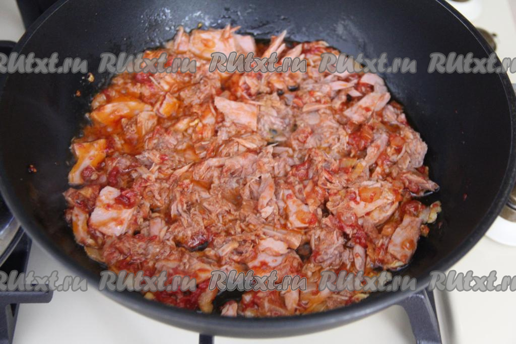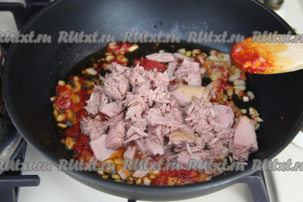 Обжарить тунца с луком и чесноком 2-3 минуты, периодически перемешивая.