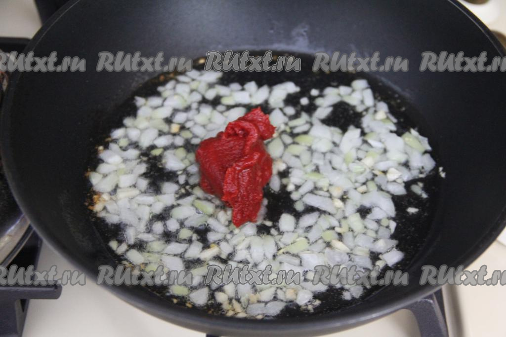 В сковороду с обжаренными луком и чесноком добавить томатную пасту, перемешать и обжаривать 1 минуту.