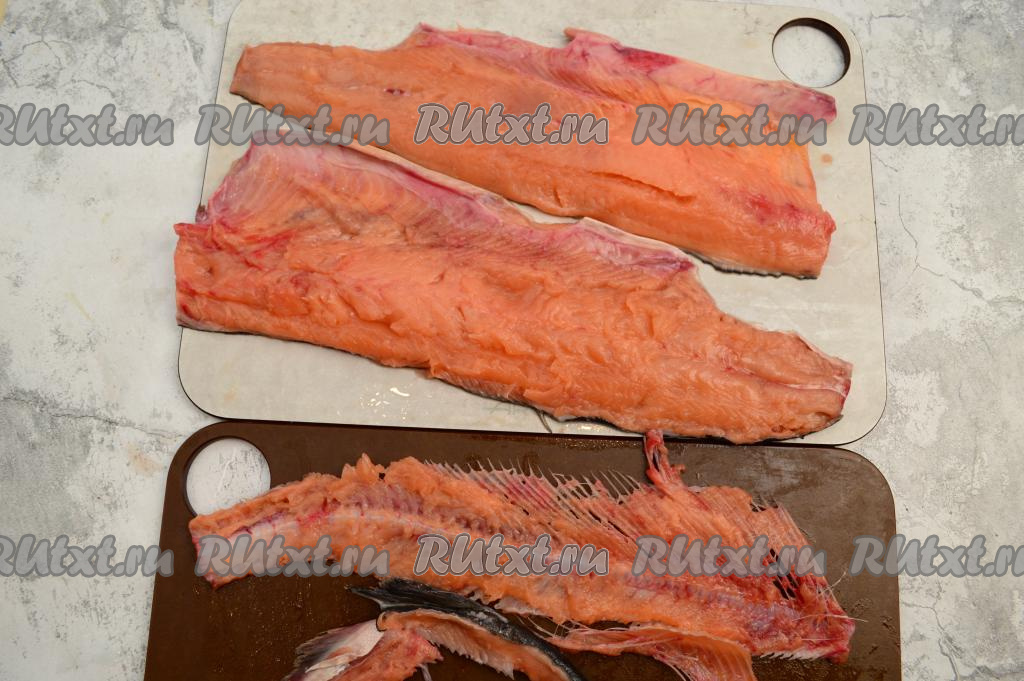 Разрезать рыбку на два филе по хребтовой кости. Аккуратно отделить хребет и рёберные косточки. У вас должно получиться вот таких 2 филе горбуши. Голову, удалив из неё жабры, промыть под проточной водой. Голову, хребет и хвост горбуши можно сразу использовать для варки наваристого рыбного супа, ну а если сразу не планируете варить суп, тогда сложите эти части рыбы в пакет и заморозьте.