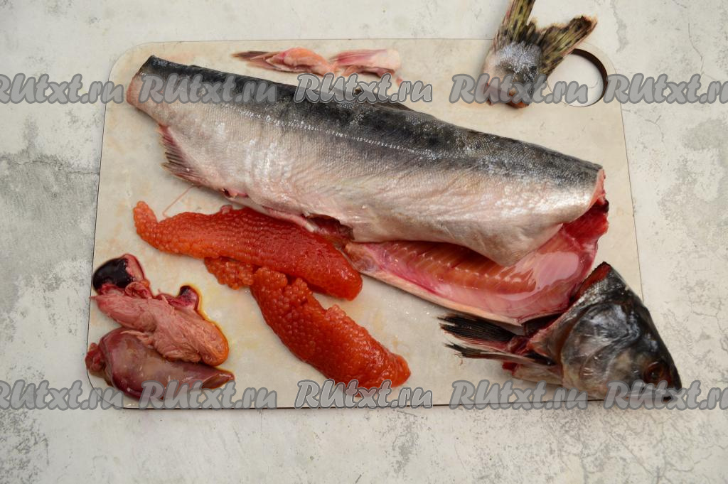 У горбуши отрезать голову, плавники, хвост. Разрезать брюшко и удалить внутренности. У меня горбуша была с икрой, её я засолила отдельно.
