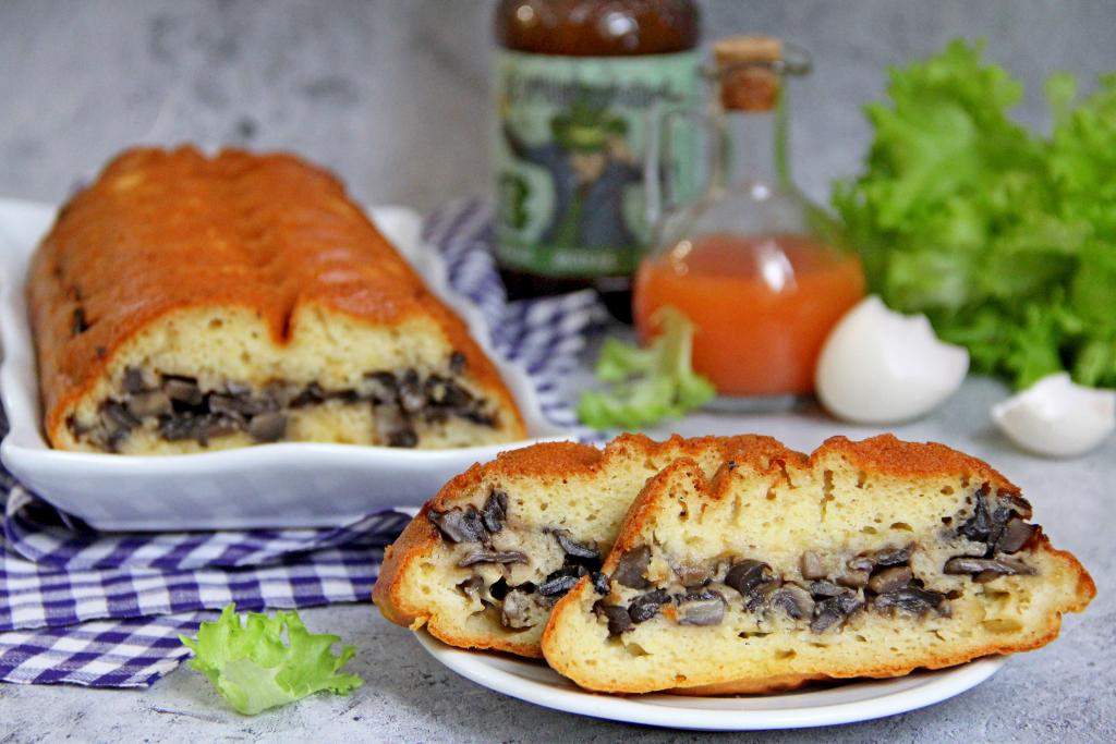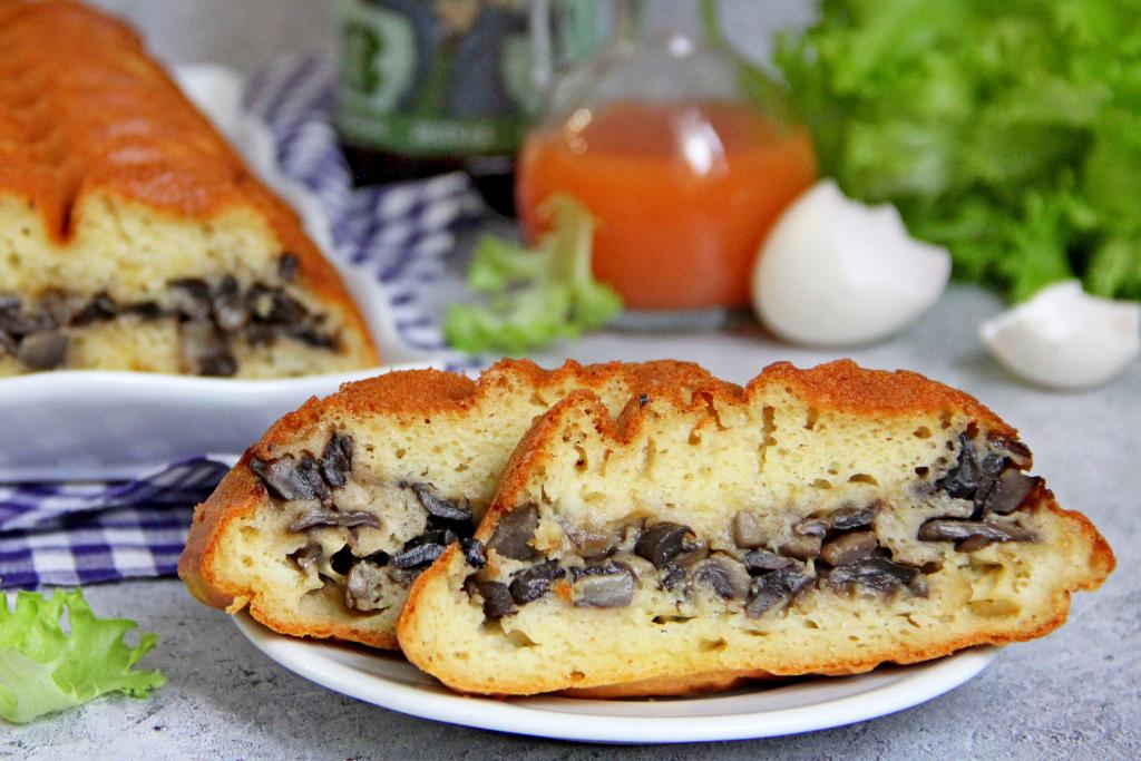 Готовый заливной пирог с начинкой из грибов и сыра достать из духовки, слегка остудить, а затем вынуть из формы, дать немного остыть на решётке. Тёплую или полностью остывшую вкусную, нежную выпечку нарезать на кусочки и подать к столу.