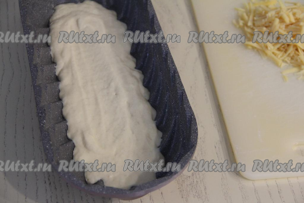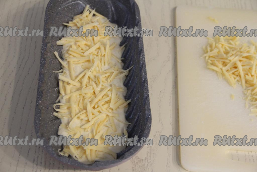 Сыр натереть на крупной тёрке. Присыпать тесто половиной натёртого сыра.