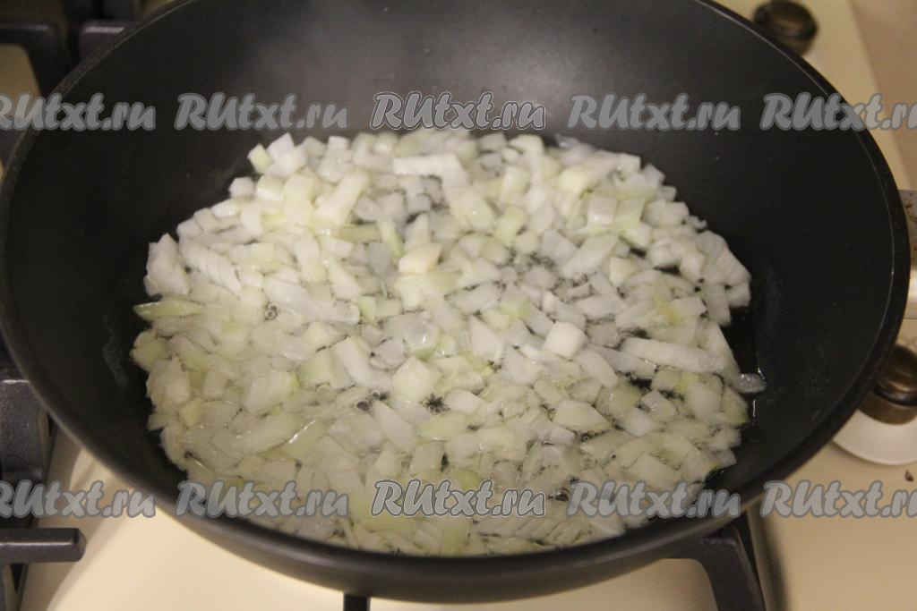 В сковороду влить растительное масло, немного разогреть его, затем выложить мелко нарезанный лук. Обжаривать лук до прозрачности (ориентировочно минуты 3-4) на среднем огне, периодически перемешивая.