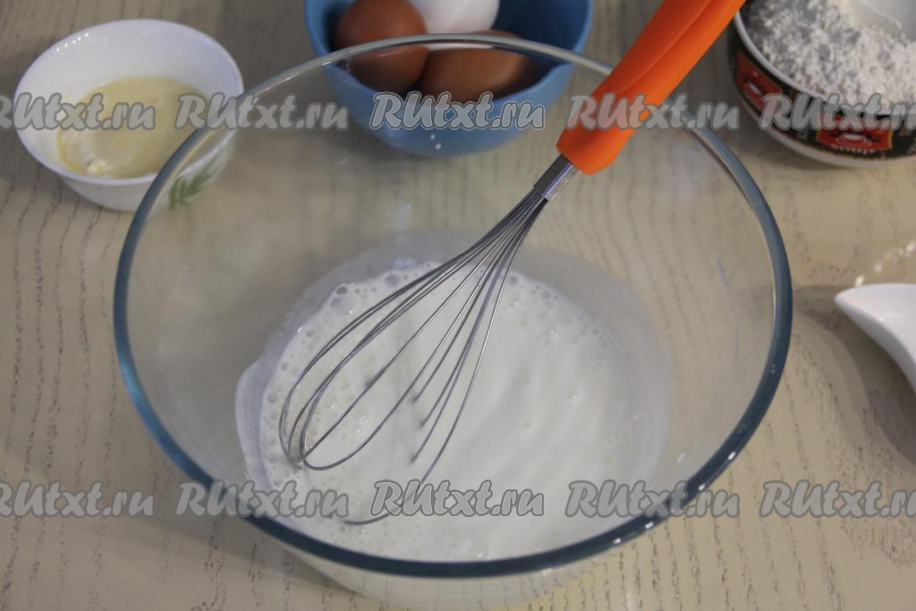 Затем в смесь кефира и соды вбить сырые яйца, перемешать венчиком до однородности.