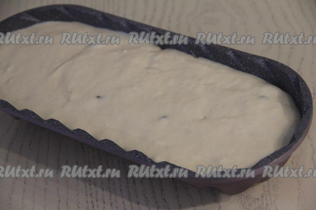 Форму для выпечки можно использовать круглую диаметром 20-22 сантиметра. Я взяла прямоугольную форму размером 32 сантиметра на 13 сантиметров. Дно и бока формы смазать растительным (или сливочным) маслом. В подготовленную форму выложить половину теста.
