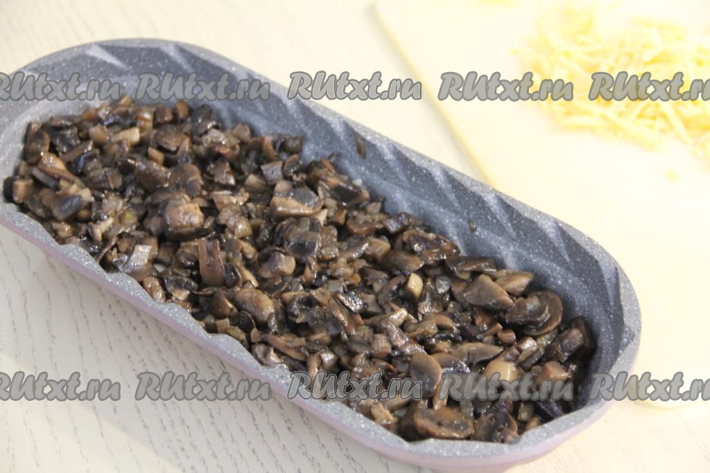 Жарить грибы с луком минут 15-20 минут (до полного испарения жидкости), иногда помешивая. За несколько минут до окончания жарки посолить по вкусу, снять грибную начинку с огня и дать остыть.