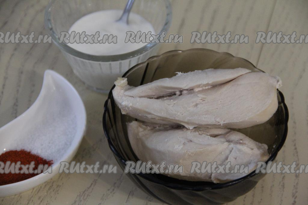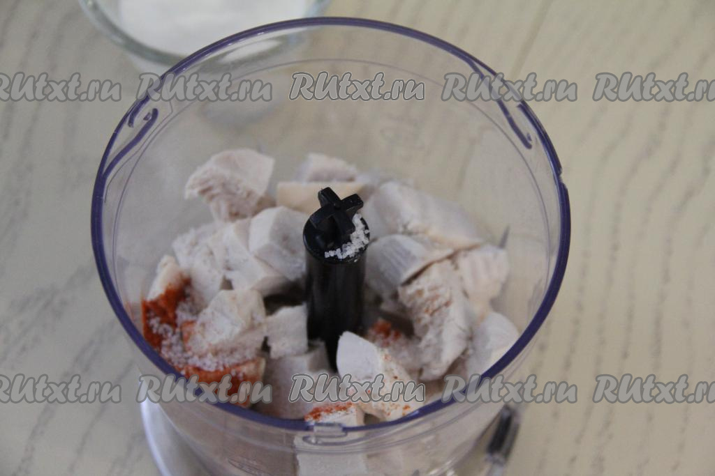 Остывшее куриное мясо нарезать на кусочки и поместить в измельчитель, добавить соль и специи (я взяла 1 чайную ложку паприки). Добавляя соль, учитывайте, что мясо варилось в подсоленной воде.