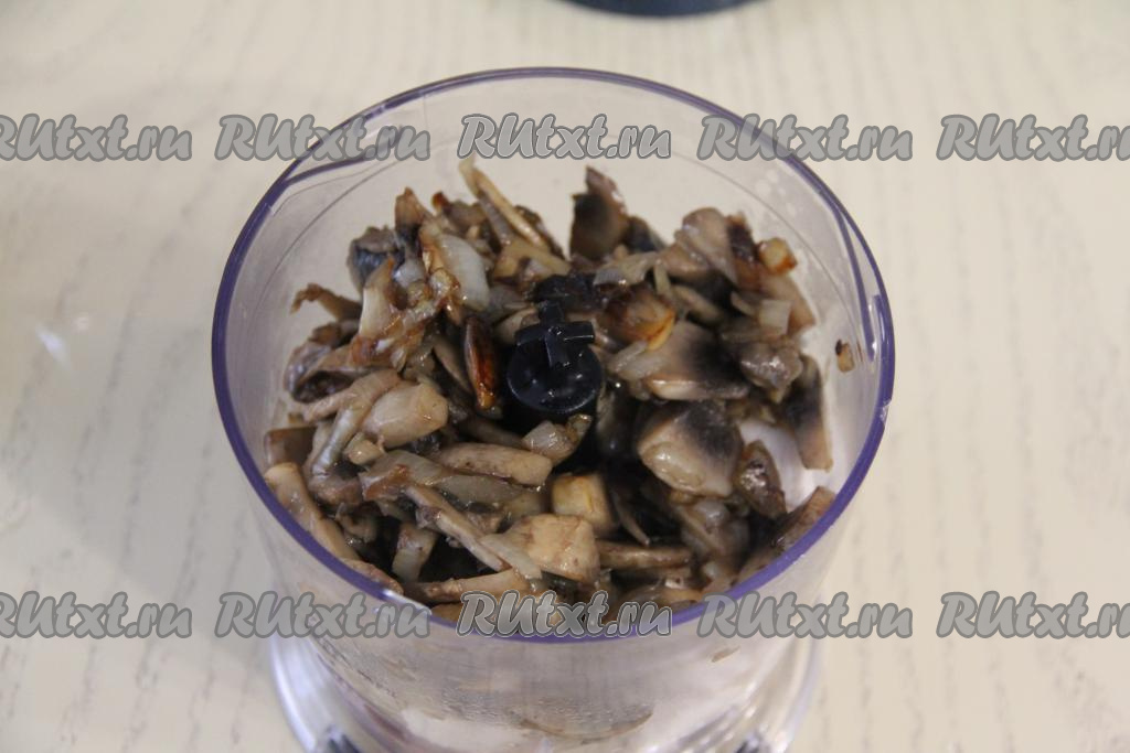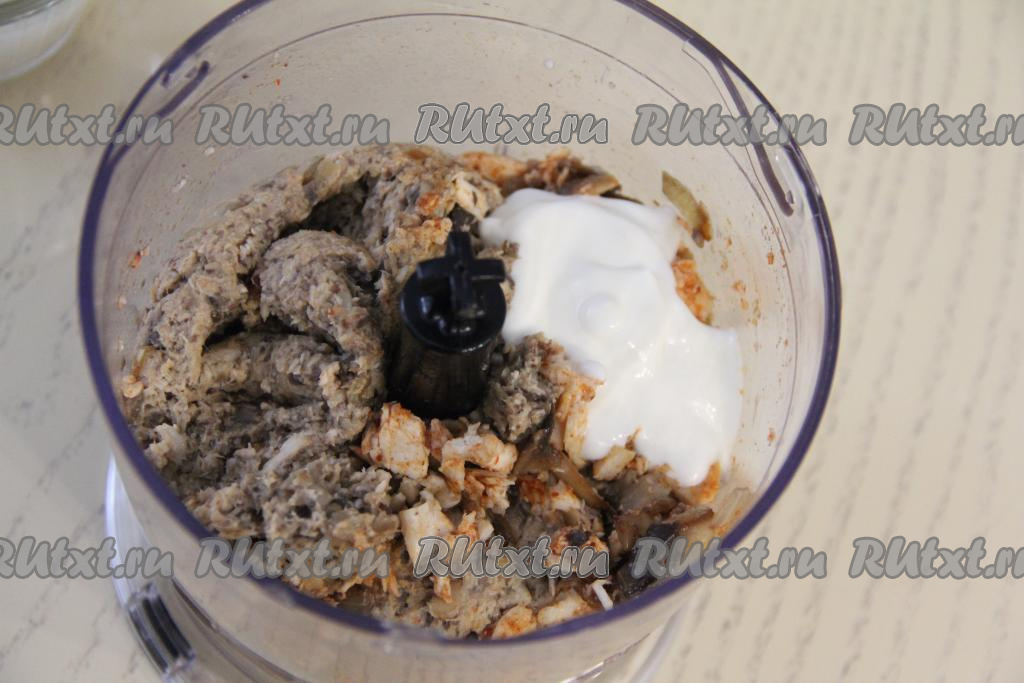 Пробить паштет из курицы с грибами до однородности. Если нет измельчителя, можно пробить шампиньоны с куриным мясом погружным блендером до однородности, а затем вмешать нужное количество сметаны, регулируя густоту паштета.