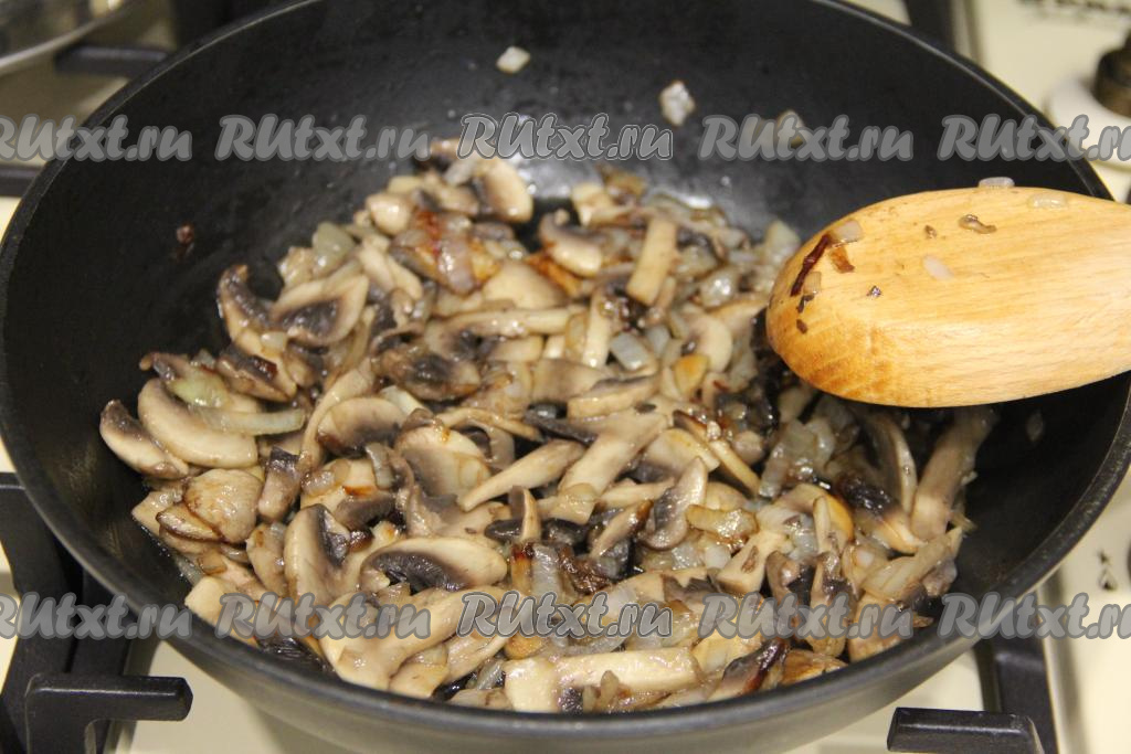 Шампиньоны промыть водой, убирая загрязнения с грибов. Луковицу очистить. В сковороду, хорошо разогревшуюся с растительным маслом, выложить мелко нарезанную луковицу. Обжарить лук на среднем огне до прозрачности (в течение 3-4 минут), иногда помешивая. Затем добавить в сковороду шампиньоны, нарезанные на пластины, перемешать. Обжаривать грибы с луком минут 15, иногда помешивая. Убрать с огня, дать немного остыть.