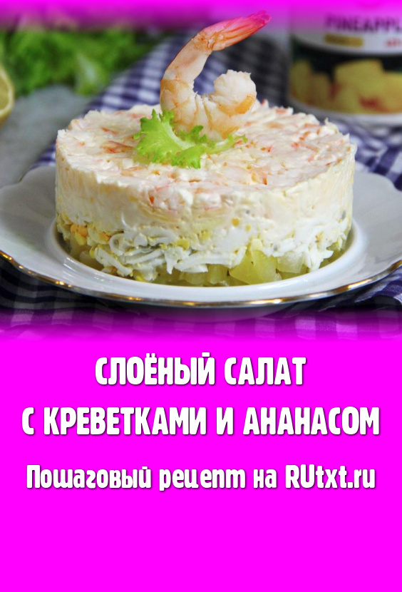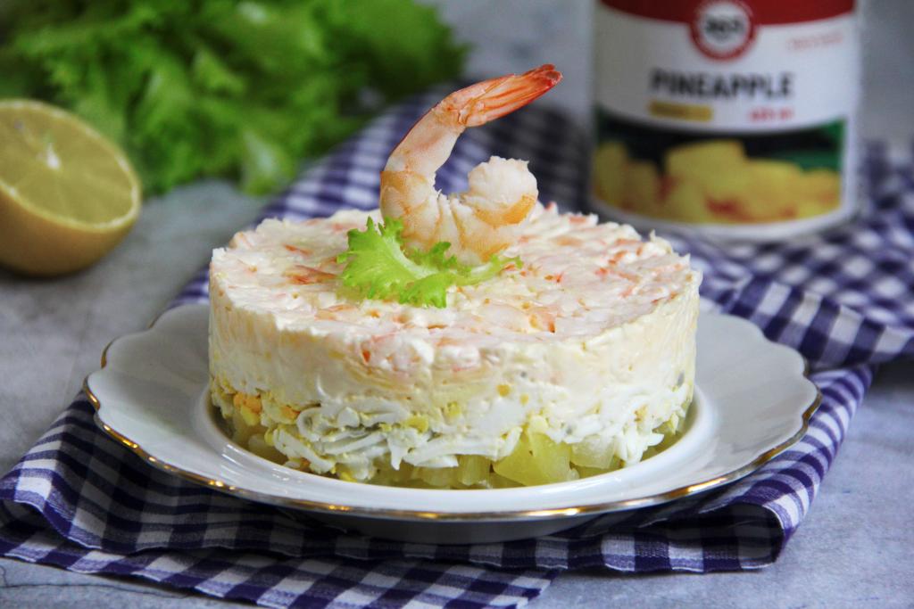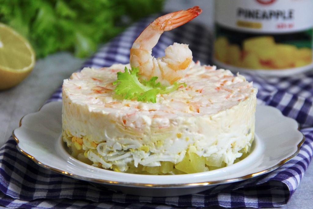 Затем убрать кольцо. Вкусный, нежный слоёный салат, приготовленный с креветками и ананасом, украсить отложенной креветкой и подать к столу.