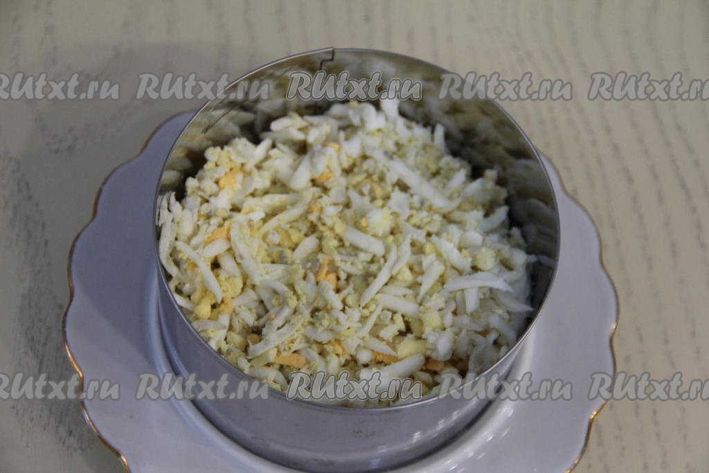 Смазать ананасы тонким слоем майонеза. Следующим слоем выложить яйца, натёртые на крупной тёрке.
