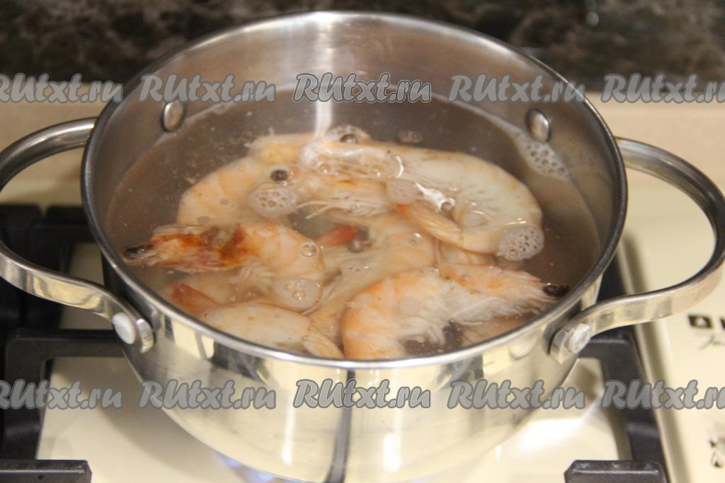 В кастрюле вскипятить воду, выложить замороженные креветки и варить их с момента закипания 2-3 минуты на небольшом огне.
