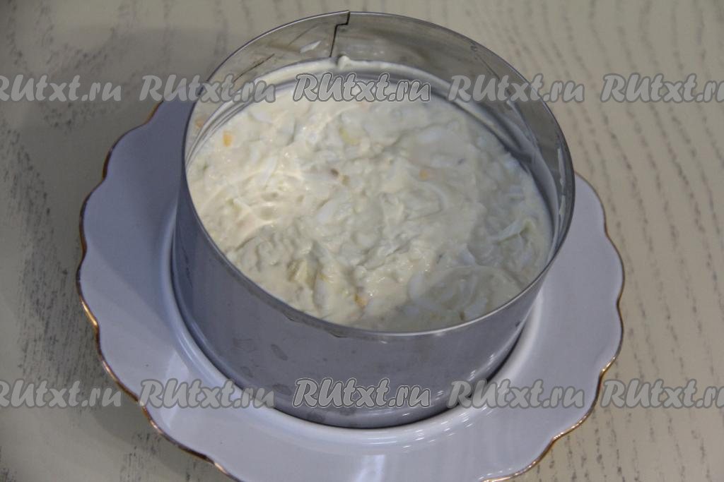 Нанести тонкий слой майонеза и слегка утрамбовать.