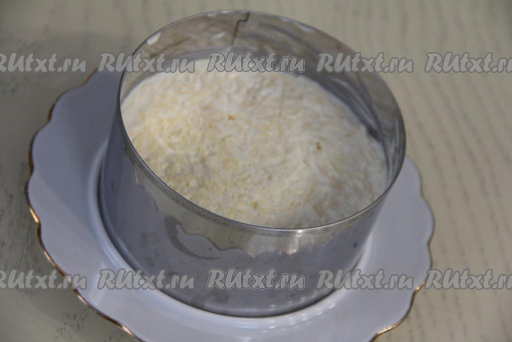 Выложить следующим слоем сыр, натёртый на мелкой тёрке.