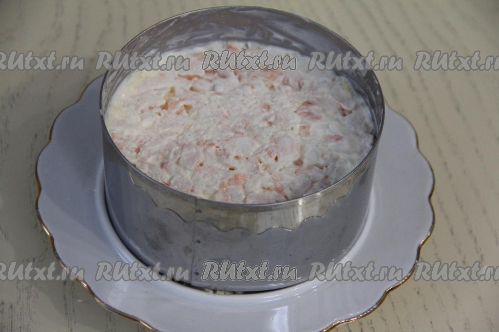 Кулинарное кольцо диаметром 12 сантиметров выставить на плоскую тарелку. Ананасы нарезать на мелкие кубики и выложить в кольцо первым слоем.