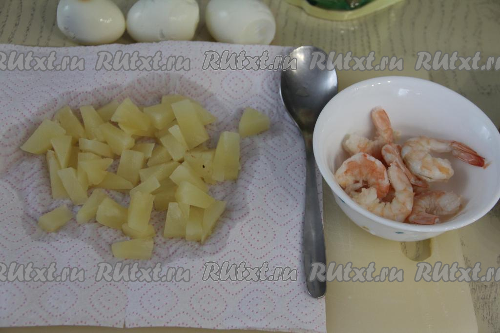 Консервированные ананасы выложить на салфетку, чтобы удалить излишки сока. Креветки откинуть на дуршлаг и остудить. Затем очистить креветки, удаляя голову, хвост и панцирь. 1 креветку я очистила, но оставила с хвостиком, эту креветочку я отложила в сторону и использовала для украшения салата.
