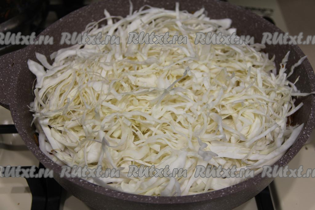 Капусту нарезать на тонкие полоски, добавить в сковороду, влить 100 миллилитров воды.