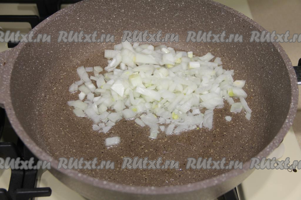 Взять достаточно объёмную и глубокую сковороду, влить в неё растительное масло, разогреть его и выложить мелко нарезанный лук. Уменьшив огонь до среднего, обжарить лук до прозрачности (в течение 3-4 минут), периодически помешивая.