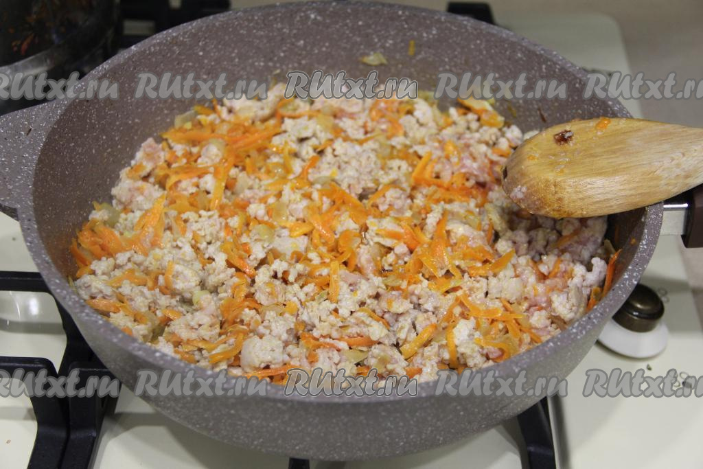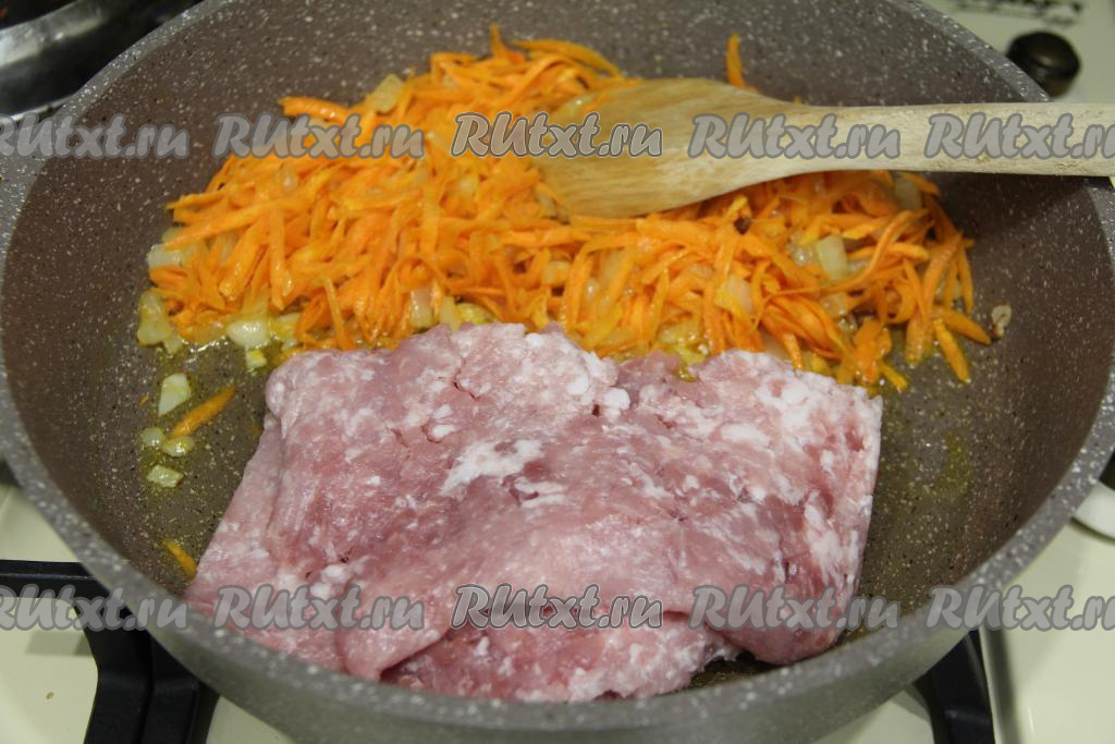 После того как фарш обжарится 2-3 минуты, перемешать его с морковкой и луком. Обжаривать фарш с овощами, иногда помешивая, до изменения цвета фарша.