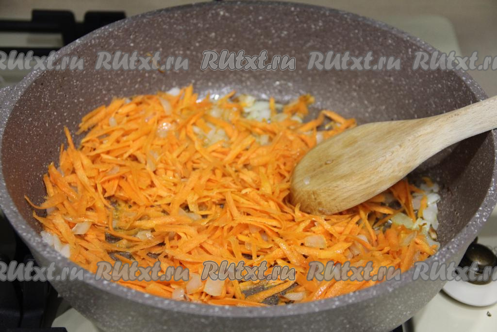 После того как лук станет прозрачным, добавить к нему натёртую на крупной тёрке морковь, перемешать овощи и обжаривать минут 5 (до мягкости морковки).