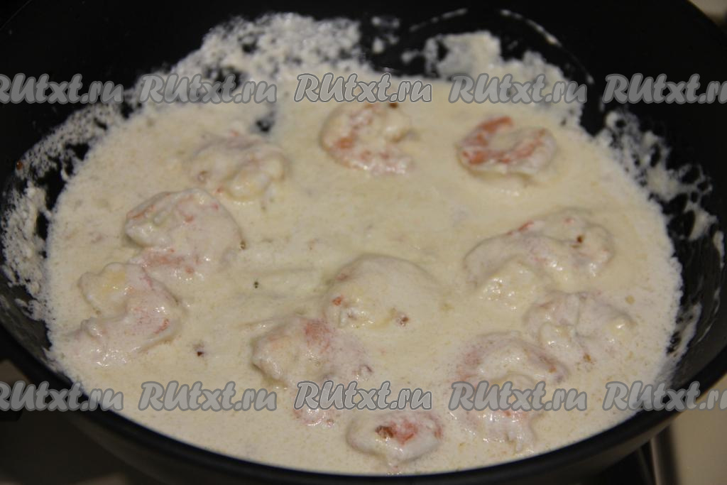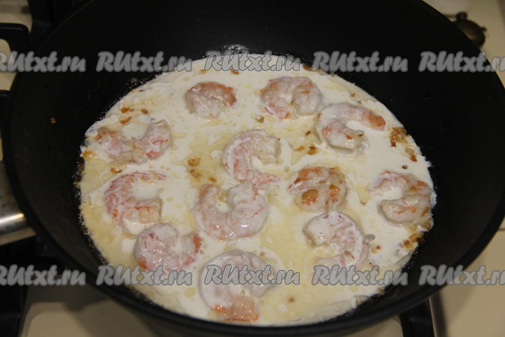 В сковороду с креветками влить сливки и на медленном огне довести соус до кипения.