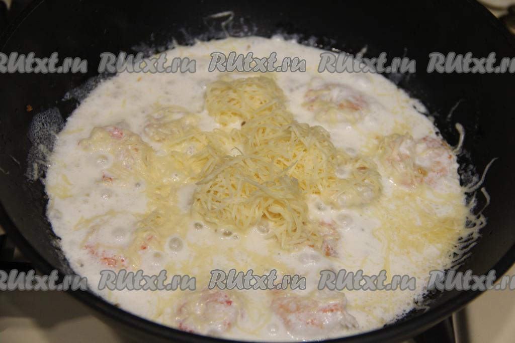 Посолить сливочный соус по вкусу, добавить в сковороду сыр, натёртый на мелкой тёрке, перемешать.