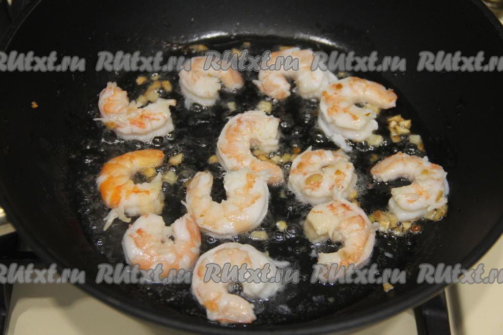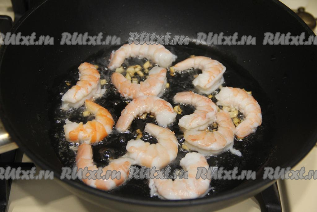 Обжарить креветки по 1,5 минуты с каждой стороны.