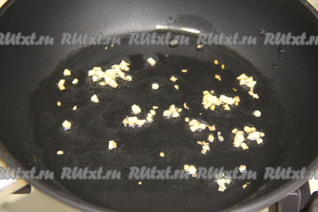 В сковороду влить растительное масло, разогреть, выложить очищенный и мелко нарезанный чеснок, обжаривать его 1 минуту на среднем огне, иногда перемешивая.