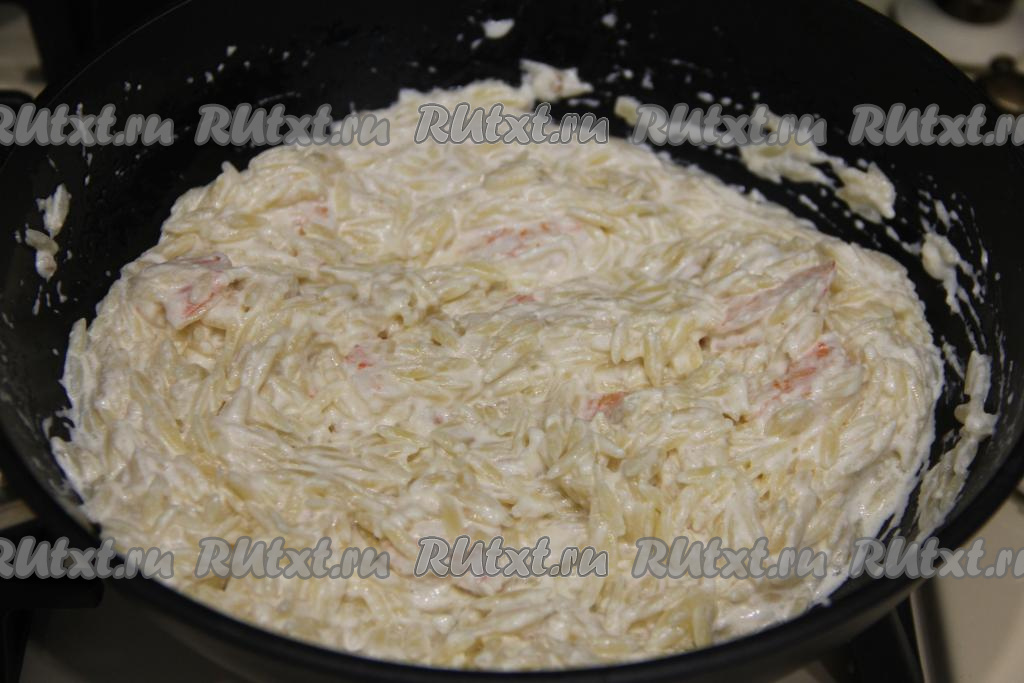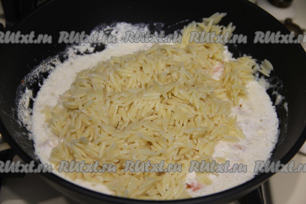 Добавить пасту "Орзо" в сковороду к сливочному соусу и креветкам, перемешать.